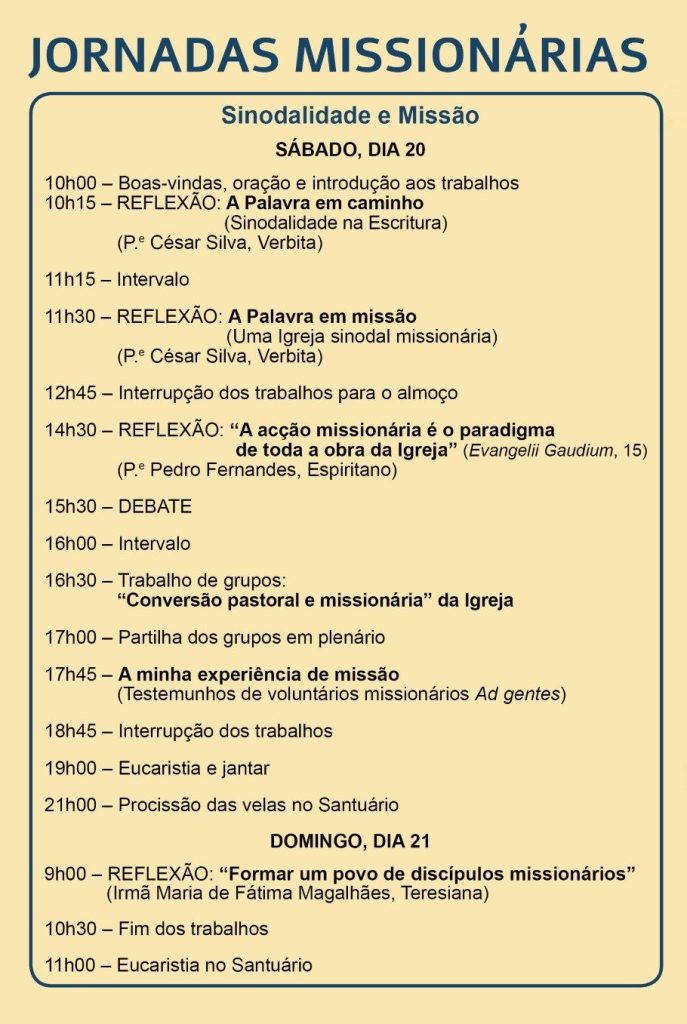 Programa das Jornadas Missionárias 2025, nos dias 20 e 21 de setembro. Inscreva-se aqui.