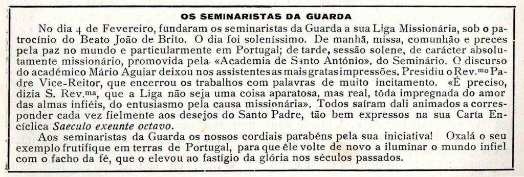 No início dos anos 40, a introdução da secção “Rádio Missões” veio reforçar a importância de cativar os jovens para a problemática missionária. Entre as emissões publicadas nas páginas da revista posteriores à encíclica de Pio XII, Fr. Luís de Santo Tirso, pseudónimo do P. Luís Gonçalves Monteiro, anunciava: «em Portugal já se fundou a “Liga Académica Missionária de Coimbra”, para os estudantes filiados no C.A.D.C. [Centro Académico de Democracia Cristã]». E apelava: «Oxalá que em breve possamos dizer […] que a “Liga Missionária Académica” é uma grande e prometedora realidade na Pátria do Beato João de Brito» (MC, ano XVII, n.º 197, dez. 1940). Ao apelo responderam no ano seguinte os seminaristas da Guarda, esperando «fundar a sua Liga Missionária no dia 4 de Fevereiro, dia do Beato João de Brito». (ano XIX, n.º 211, fev. 1942, p.27), o que se verificou (ano XIX, n.º 212, mar. 1942, p.48). Em abril, as páginas de O Missionário Católico eram animadas com a carta de um seminarista de Bragança, datada de 15 de março, sugerindo a criação da Liga Missionária dos Seminaristas de Portugal (ano XIX, n.º 213, abr. 1942, p.58), ideia reforçada pela emissão da “Rádio Missões” de maio (ano XIX, n.º 214, mai. 1942, p.78). Em julho, era noticiada a existência de Ligas Missionárias nos Seminários de Coimbra, Guarda, Bragança e Vilar (ano XIX, n.º 216, jul. 1942, p.100). Em outubro, pela proximidade do Dia Mundial das Missões, D. Manuel Ferreira da Silva, na qualidade de Presidente Nacional da UMC, dirigiu-se aos Seminaristas de Portugal, em especial aos membros das Ligas Missionárias, para que celebrassem convenientemente este dia (ano XIX, n.º 219, out. 1942, p.133).